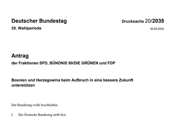 Bundestag je razmatrao dokument koji su u parlamentarnu proceduru uputili predstavnici vladajućih partija SPD, FDP i Zeleni pod nazivom “Podrška Bosni i Hercegovini na putu ka boljoj budućnosti” unutar kojeg se traži od njemačke vlade da pruži jaču podršku Bosni i Hercegovini i spriječi rast nacionalističke retorike.